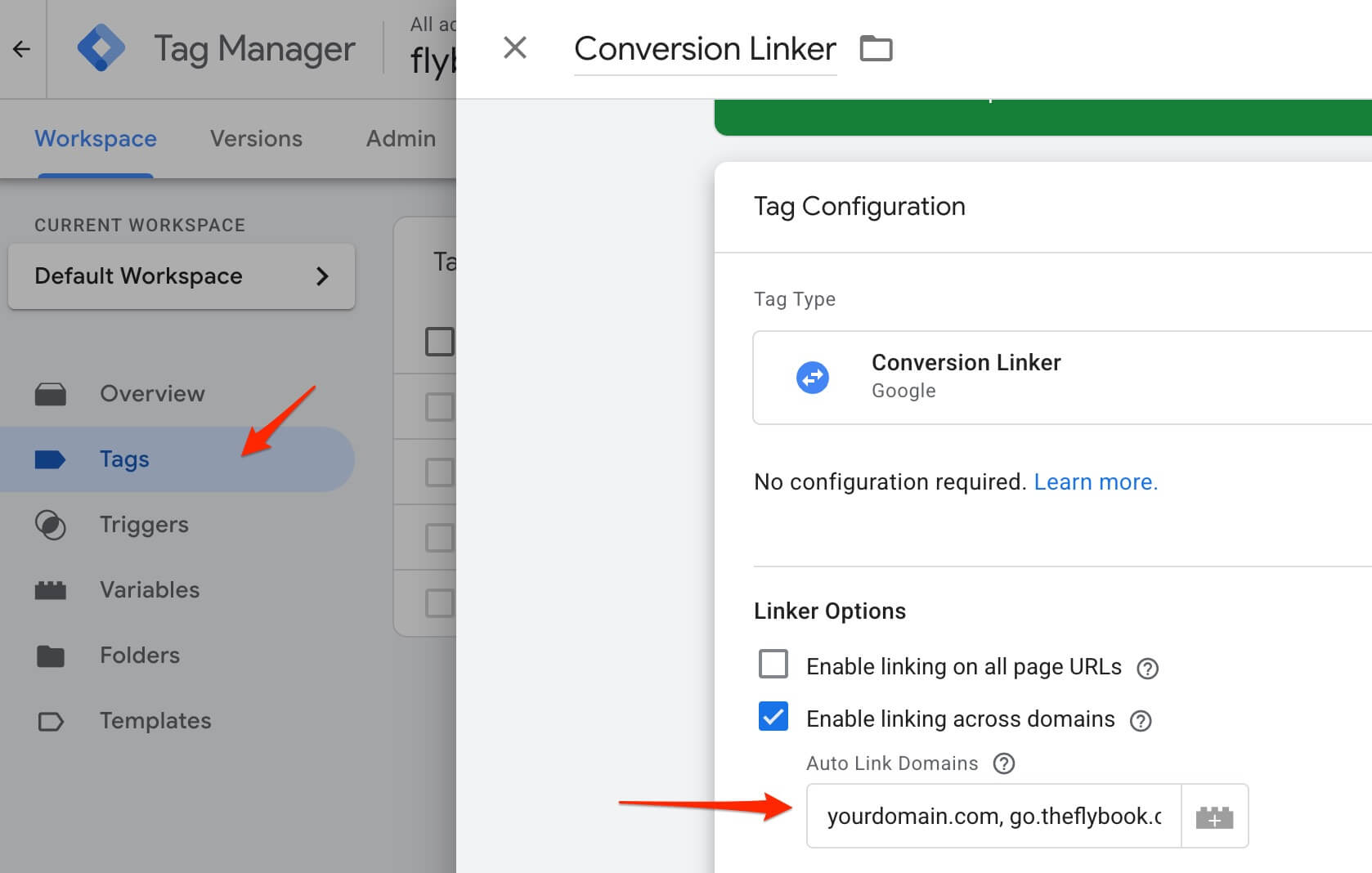 The container you imported in Step 1 already includes a Conversion Linker tag. This is the GTM tag responsible for decorating links with the _gl parameter that makes cross-domain tracking work. The GA4 admin setting in the next step tells GA4 which domains to accept that parameter from, but this tag is what generates it in the first place. Both are required.